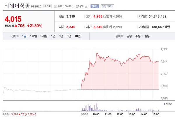 티웨이항공(091810)은 상한가 목전인 4,255원을 터치했으나 등락하며 전일대비 21.30%(705원) 상승한 4,015원에 장을 마쳤다.