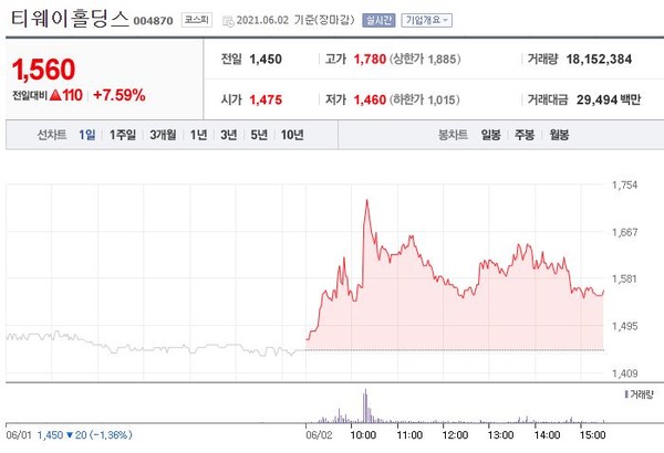 장 초반 1,780원을 터치한 주가는 전일대비 7.59%(110원) 상승한 1,560원에 거래를 마쳤다.