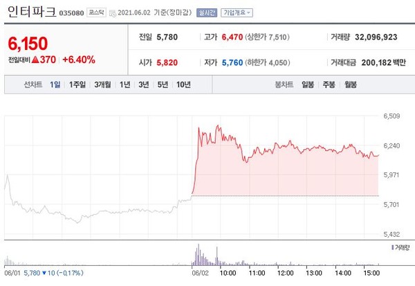 장 초반 급등한 주가는 전일대비 6.40%(370원) 상승한 6,150원에 장을 마쳤다.