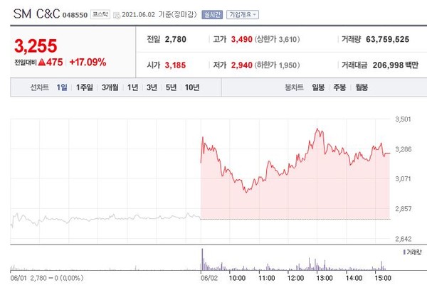 앞서 SM C&C는 지난 4월 28일 네이버와 카카오가 이수만 SM 최대주주의 지분 등을 인수하기 위한 경쟁을 벌이고 있다는 보도에 한 차례 상한가를 달성한 바 있다.