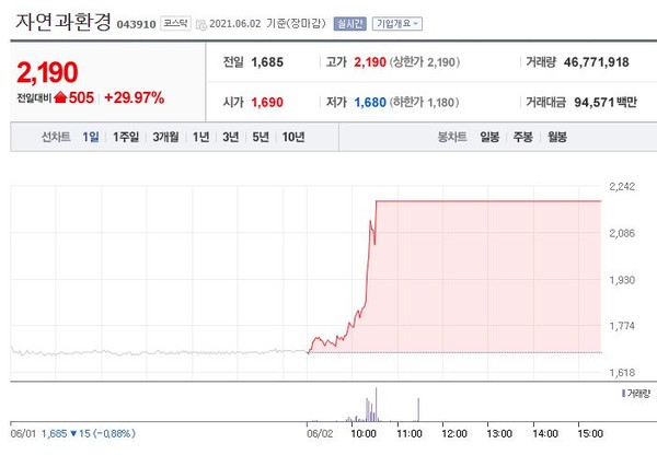 자연과환경(043910)은 전일대비 29.97%(505원) 상승한 2,190원에 장을 마감했다.