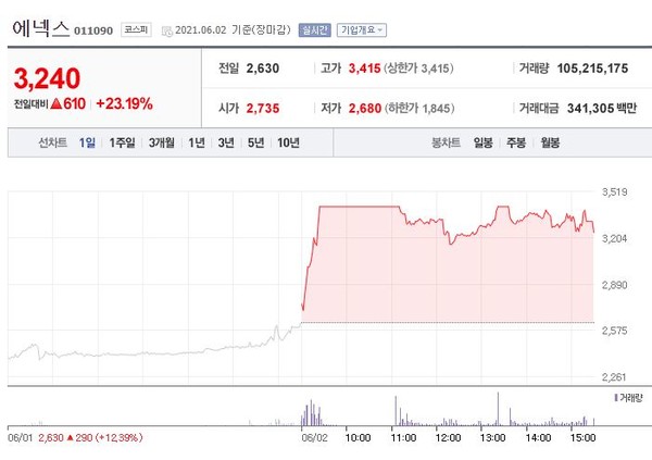 에넥스(011090)는 장중 상한가를 터치하며 급등했다.