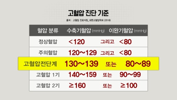 [문화뉴스 정혜민 기자] 고혈압 전단계, 130mmHg. 우리나라는 수축기 혈압이 140mmHg 이상이거나 이완기 혈압이 90mmHg 이상이면 고혈압으로 진단한다. 그런데 2017년 미국에서는 새로운 고혈압 진단 기준을 제시했다. 새로운 기준은 우리나라 기준보다 10mmHg 낮은 130mmHg에 80mmHg! 우리나라는 이 단계를 고혈압 전단계라고 칭한다. 의학계에선 이 단계에서부터 고혈압처럼 관리를 하라고 권고하는데 그 근거를 평균 수명 100세 시대에 둔다.