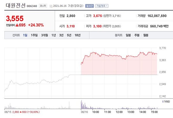 대원전선우(006345)는 장중 가격제한폭까지 올라 전일대비 29.83%(1,390원) 상승한 6,050원으로 마감했다.