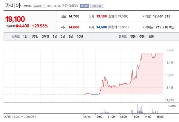 가비아(079940)는 장중 상한가를 달성했다.