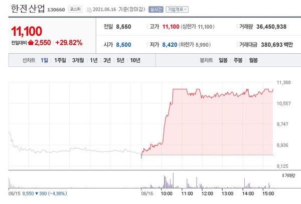 한전산업(130660)은 오전 10시께 가격제한폭까지 오르며 전일대비 29.82%(2,550원) 상승한 11,100원에 장을 마감했다.