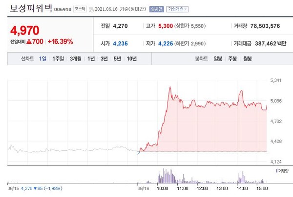 장중 상한가 목전인 5천3백원을 터치한 주가는 전일대비 16.39%(700원) 상승한 4,970원에 장을 마감했다.