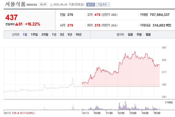 서울식품(004410)은 전일대비 16.22%(61원) 상승한 437원에 거래를 마쳤다. 거래량은 708,360,079주로 이날 유가증권시장에서 가장 많은 거래량을 기록했다.