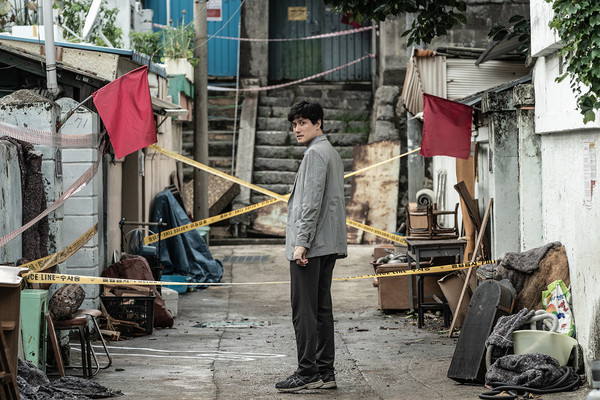 괴이하게 말라비틀어진 시체를 바라보는 강력계 형사 ‘호태’의 스틸은 긴장감을 끌어올리는 끈질긴 집념을 보여준다.