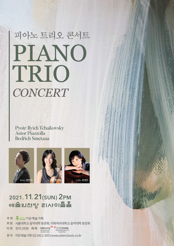 [문화뉴스 백현석 기자] 피아니스트 함인아, 바이올리니스트 배현희, 첼리스트 정영안으로 구성된 피아노 트리오 콘서트가 오는 11월 21일 일요일 오후 2시, 예술의전당 리사이틀홀에서 열린다.