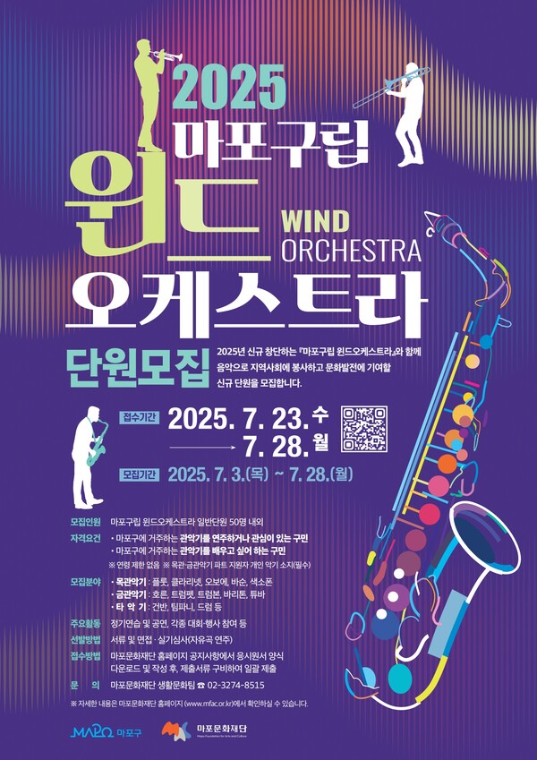 모집 대상은 마포구에 거주하는 구민 누구나로, 연령, 전공, 연주 경험 여부에 관계없이 관악기를 연주하거나 배우고 싶은 열정을 가진 사람이라면 모두 지원 가능하다.