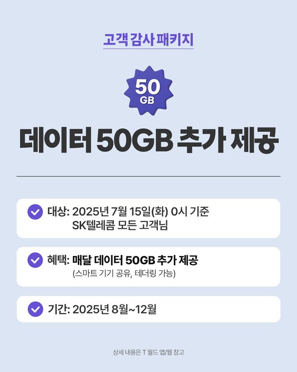 이와 함께 고객 회복 차원에서 8월 한 달간 통신 요금 50% 감면, 연말까지 매월 데이터 50GB 추가 제공, T멤버십 제휴사 할인 확대 등의 혜택도 제공한다.
