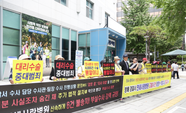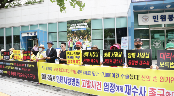 지난 6일, 국민생명안전네트워크, 국민연대, 행•의정감시네트워크 중앙회 등 주요 시민단체는 서울경찰청 앞에서 기자회견을 열고, 연세사랑병원과 관련된 불법 대리수술 등 총 6건의 고발 사건에 대해 모두 ‘혐의 없음’으로 결론 내린 방배경찰서를 강하게 비판했다.