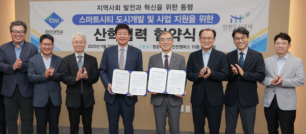 문화뉴스 김인환 기자 = 인천도시공사(iH)는 청운대학교(총장 정윤)와 29일 스마트시티 도시개발 지원을 위한 협약을 체결했다. 이번 협약은 도시개발과 주거복지 현장의 경험과 스마트시티 연구 역량을 결합해 지속가능한 스마트시티 개발을 추진하기 위해 체결됐다.