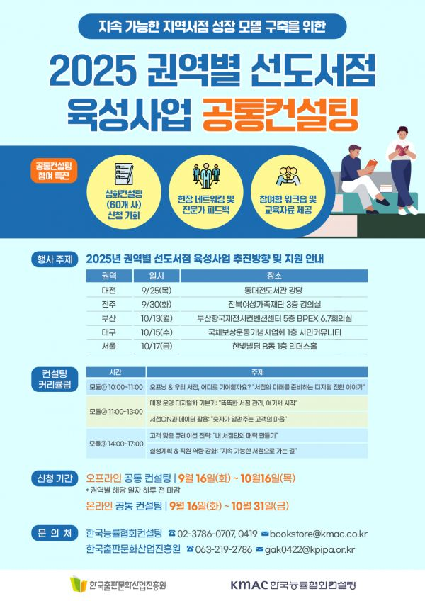 공통 컨설팅 참여 신청은 권역별 현장 참여의 경우 개최 전날까지, 온라인 참여는 10월 31일까지 접수 가능하다. 보다 자세한 내용은 출판진흥원 누리집과 서점ON 누리집에서 확인할 수 있다.