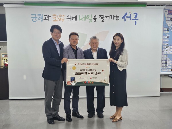 문화뉴스 김인환 기자 = 인천 서구 식품제조협회(회장 임병석)가 추석을 앞두고 지역사회에 따뜻한 정을 나눴다. 협의회는 9월 29일, 송편과 김치 등 500만 원 상당의 성품을 인천 서구청에 기부하며 이웃사랑을 실천했다.