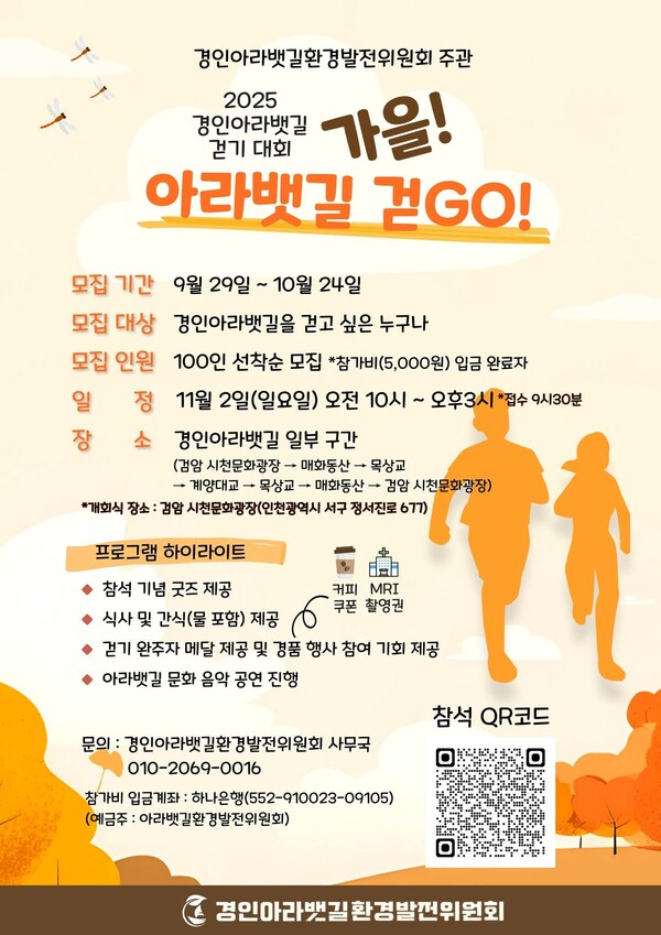 경인아라뱃길환경발전위원회는 “이번 걷기 행사는 시민들이 가을의 아름다움을 즐기며 건강을 챙기는 기회가 될 것”이라며, “앞으로도 아라뱃길의 생태 복원과 지역사회 건강 증진을 위해 다양한 활동을 이어가겠다”고 강조했다.