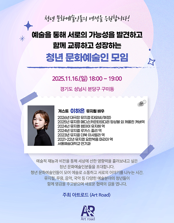 아트로드 이대은 대표는 “예술의 본질은 연결과 공감에 있다”며 “이번 모임이 예술을 매개로 서로의 경험을 공유하고, 청년들이 문화예술을 통해 지속가능한 협력 생태계를 만들어가는 출발점이 되기를 기대한다”고 밝혔다.