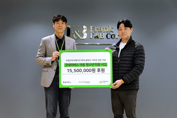 문화뉴스 김인환 기자 = 프리미엄 수제버거 브랜드 프랭크버거(회장 심우창)가 지역사회와 함께하는 나눔 행보를 이어가고 있다. 프랭크버거는 굿네이버스 인천사업본부(본부장 홍상진)에 인천지역 아동과 청소년을 위한 후원금 1,550만 원을 전달했다.