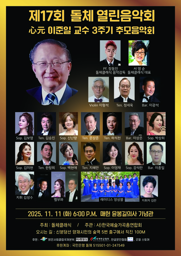 이번 공연은 고(故) 이준일 교수 3주기 추모음악회로 기획됐다. 클래식 대중화에 헌신했던 고인의 뜻을 잇기 위해 국내 중견 성악가들이 무대에 올라 주옥같은 선율을 선보인다. 사회는 시인이자 대표인 서영순이 맡아 따뜻한 해설로 공연의 몰입도를 높이고, 장동인 음악감독이 피아노 반주를 맡아 감성적인 무대를 완성한다.