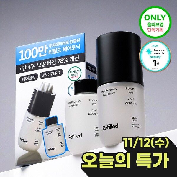 (문화뉴스 백현우 기자) 프리미엄 탈모케어 브랜드 리필드(Refilled)의 부스터 프로가 11월 12일 기준 올리브영 전체 판매랭킹 1위를 기록했다. 출시 이후 빠른 속도로 소비자 사이에서 입소문이 퍼지며, 기능성 헤어케어 시장의 대표제품으로 자리매김하고 있다.