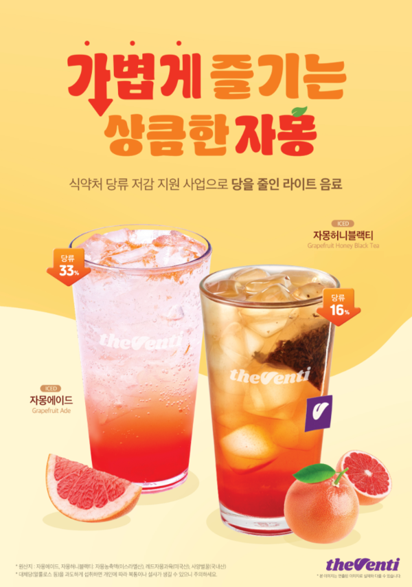 더벤티는 기존 메뉴 대비 당류를 33.4% 저감한 자몽에이드와 15.9% 저감한 자몽허니블랙티를 출시하여 더욱 가볍고 건강한 달콤함을 구현한 것이 특징이다.