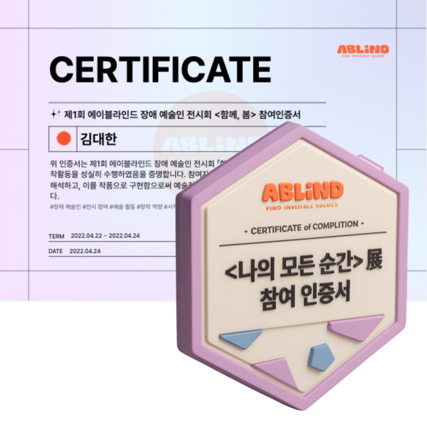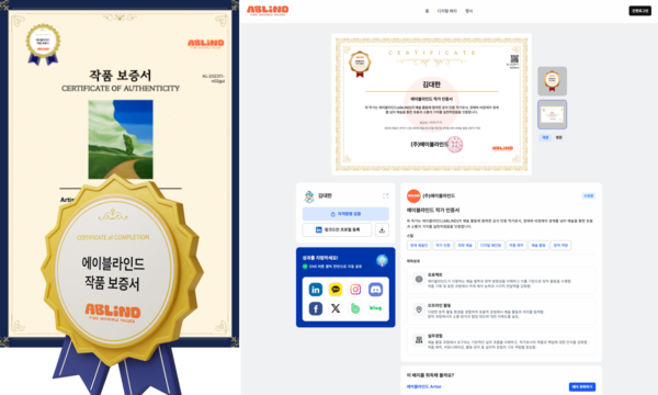 (문화뉴스 백현우 기자) 시각장애 예술 크리에이터 에이전시 ㈜에이블라인드가 국내 최초로 시각장애 예술인을 위한 디지털배지(Digital Badge) 인증 체계를 구축하고, 제1회부터 제5회 전시 참여 작가들에게v전시 참여 인증서와 작품 보증서를 디지털 형태로 발급하기 시작했다. 이번 디지털 전환은 장애 예술 분야에서 그동안 축적해온 창작·전시 활동을 데이터 기반 방식으로 기록하는 첫 사례로 평가받고 있다.