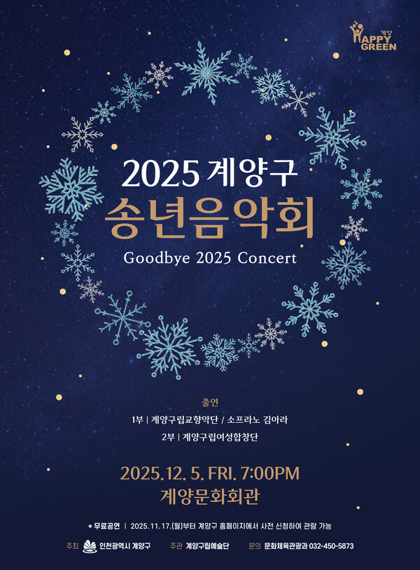 윤환 구청장은 “연말의 고단함을 잠시 내려놓고 아름다운 선율 속에서 위로받는 시간이 되길 바란다”고 말했다. 관람은 11월 17일부터 계양구청 누리집에서 무료로 사전 신청할 수 있다.