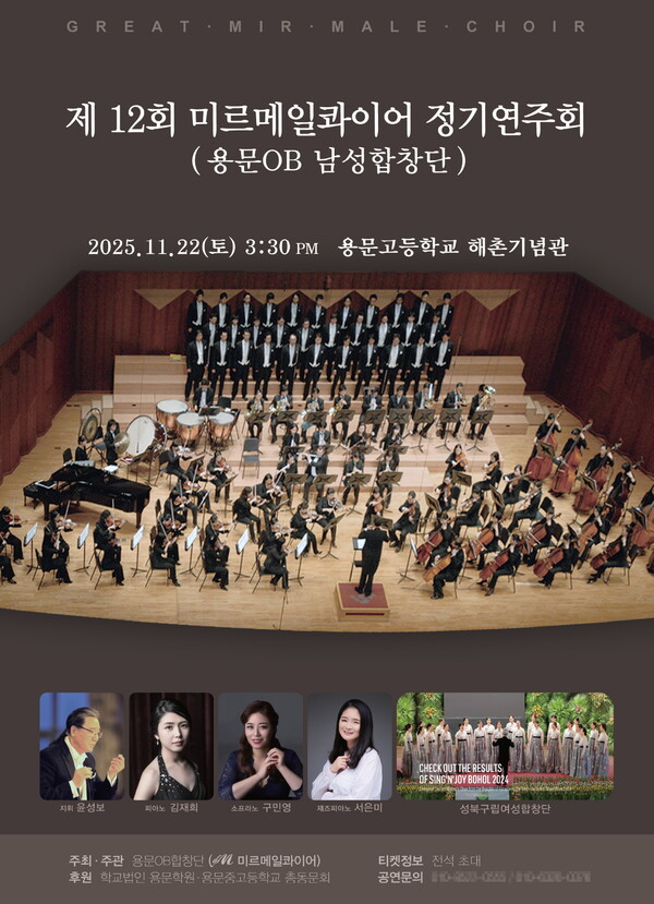 (문화뉴스 백현우 기자) 오는 22일 토요일 오후 3시 30분, 서울 성북구 용문고등학교 해촌기념관에서 미르메일콰이어 제12회 정기연주회가 성대하게 개최된다.