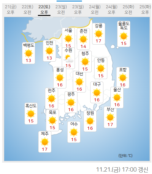 기온은 중국 남부로부터 남해상으로 확장하는 고기압의 가변적인 영향으로 모레(23일)까지 평년 기온(최저 -3도~6도, 최고 8도~15도)보다 다소 높겠다.