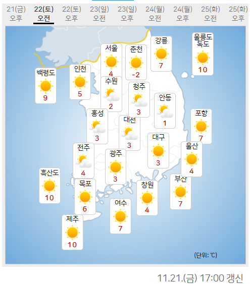 내일(22일) 아침 최저기온은 전국적으로 -3도~7도, 낮 최고기온은 13도~17도가 되겠다. 모레(23일) 아침에는 -2도~9도, 낮 최고는 13도~19도 사이를 기록할 것으로 예보됐다.